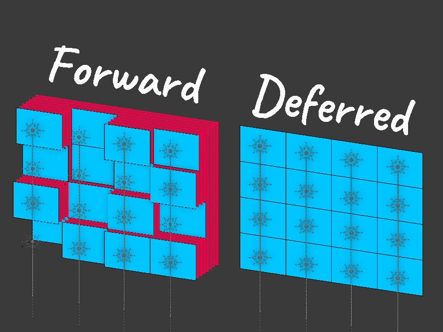 Deferred rendering (deferred shading) is a screen space lighting technique. Instead of calculating the lighting for a scene while you traverse its geometry—you defer or wait to perform the lighting calculations until after the scene's geometry fragments have been culled or discarded. This can give you a performance boost depending on the complexity of your scene.